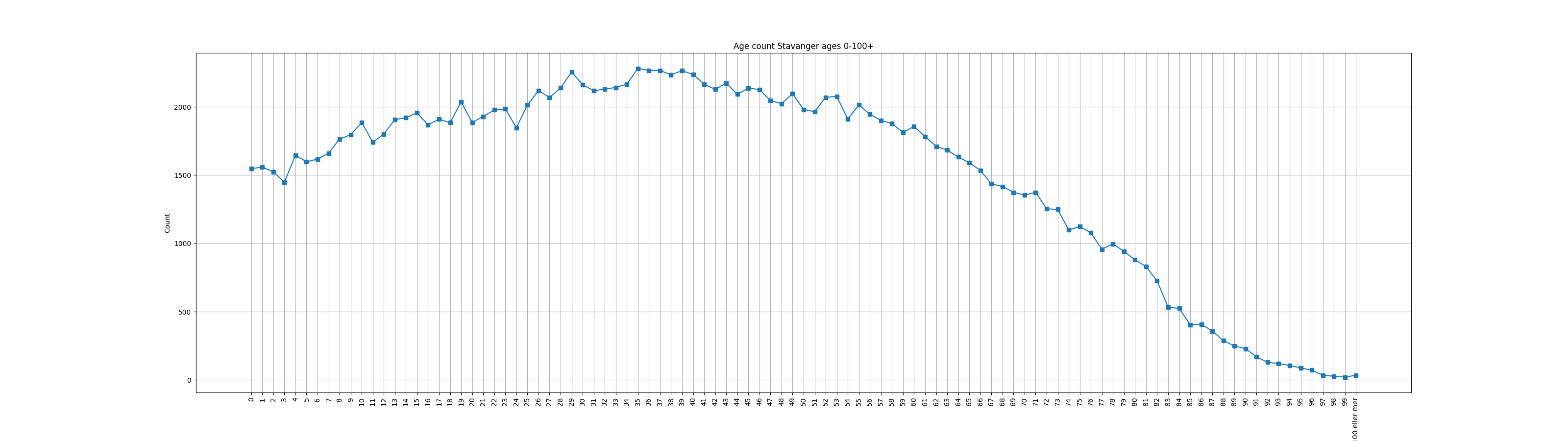 NO: Datasettet inneholder data om antall personer i Stavanger som er i en gitt alder (Nøkkel/Alder = KategoriVerdi, antall = StatistikkVerdi), i formatet CSV. Oppdateres daglig.